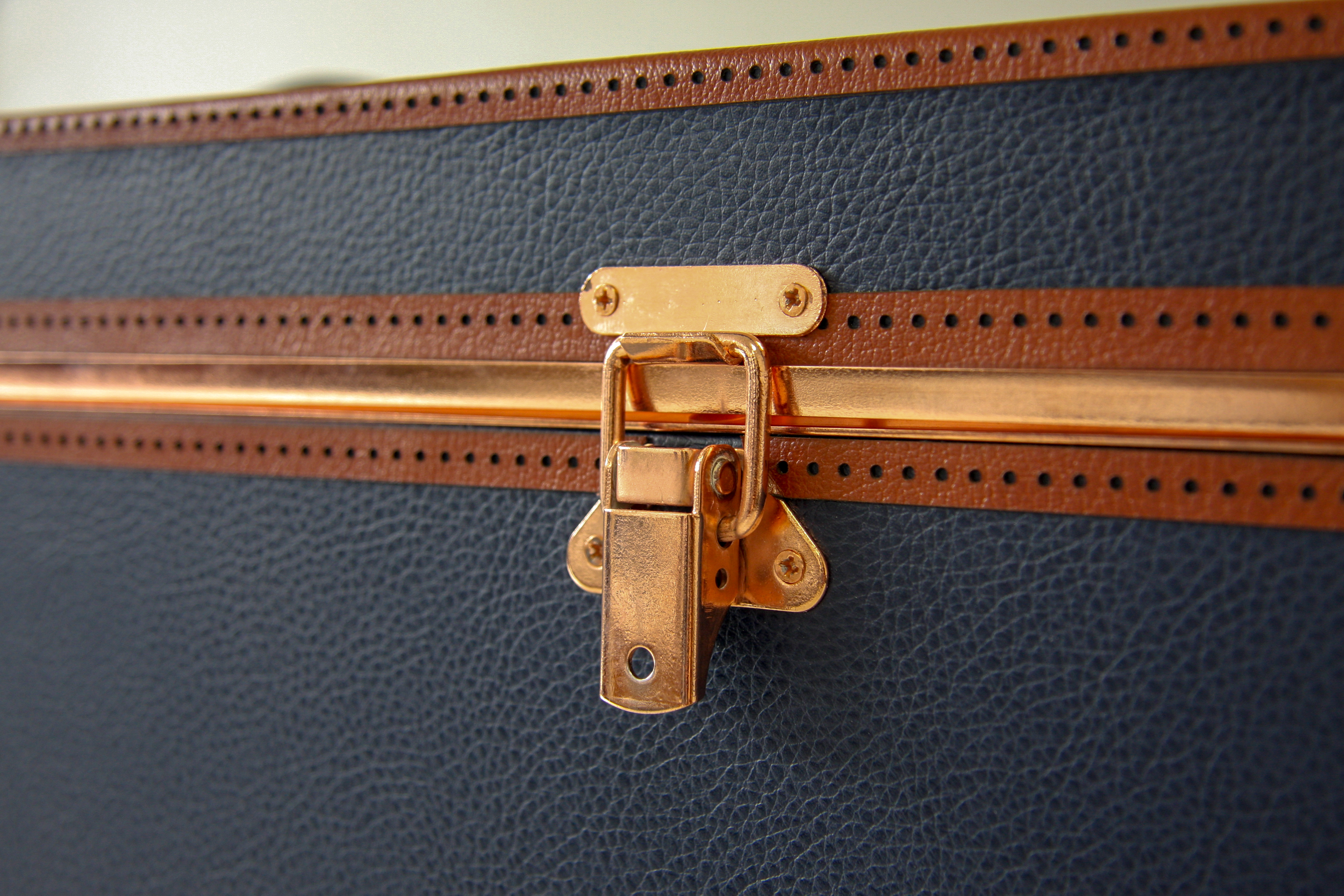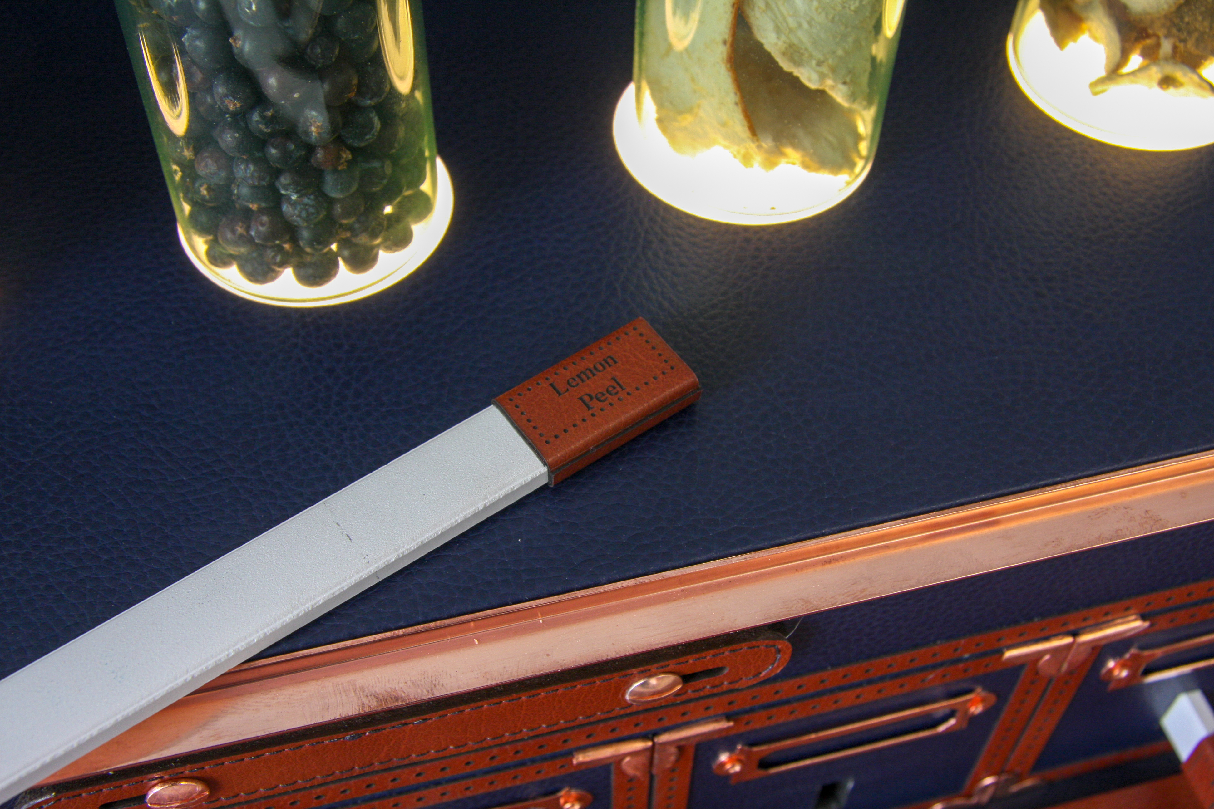 Main carcass manufactured from MDF while the interior is made from plywood. Printed blue suede inner lining with graphics and with an LED internal lighting with power supply unit. The exterior of the box is finished in vegan leather with all colours and detailing to be painted and treated to look aged. Copper corner brackets, hatches, leather handle and aged brass clasps to finish the external look. Embossing to front panel and painted/printed logo on side. Stickers and tint specialist lacquer application to supplied bottles