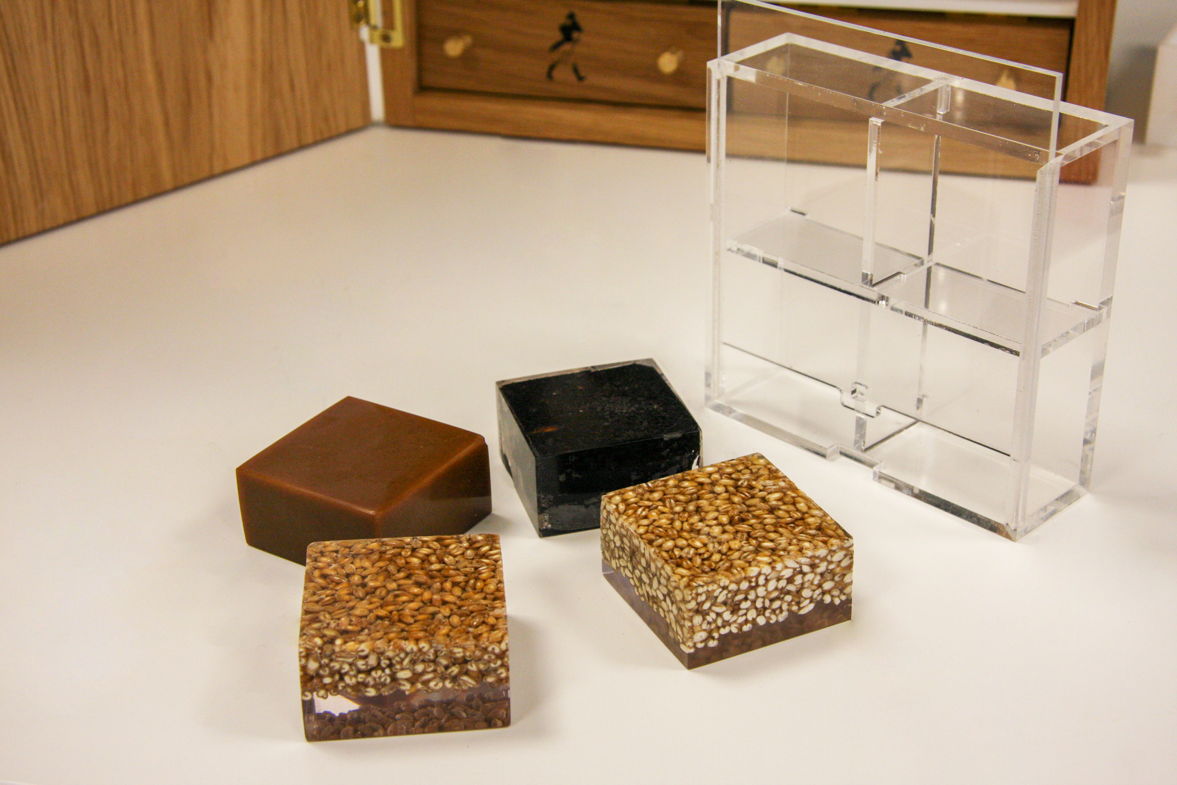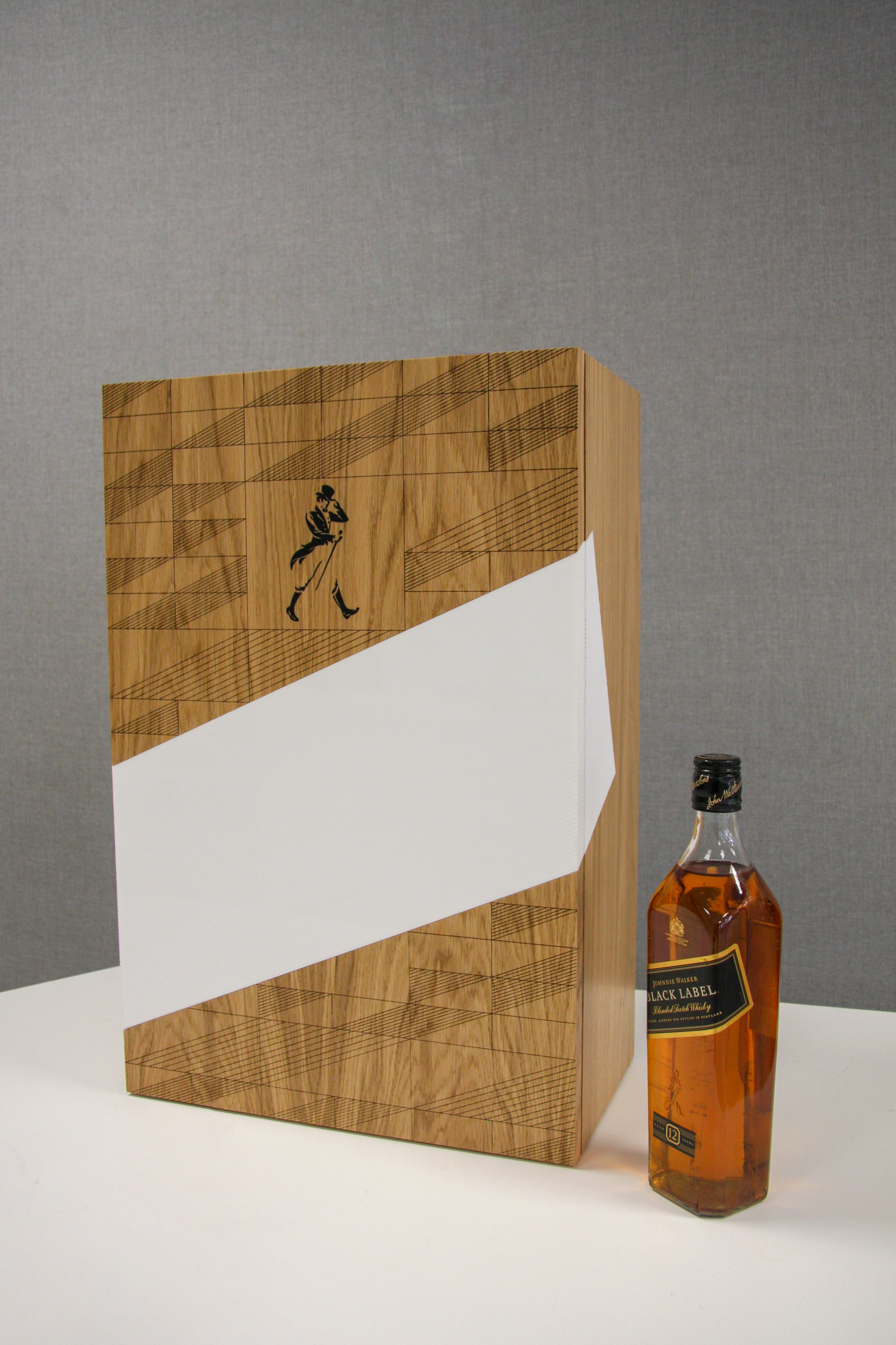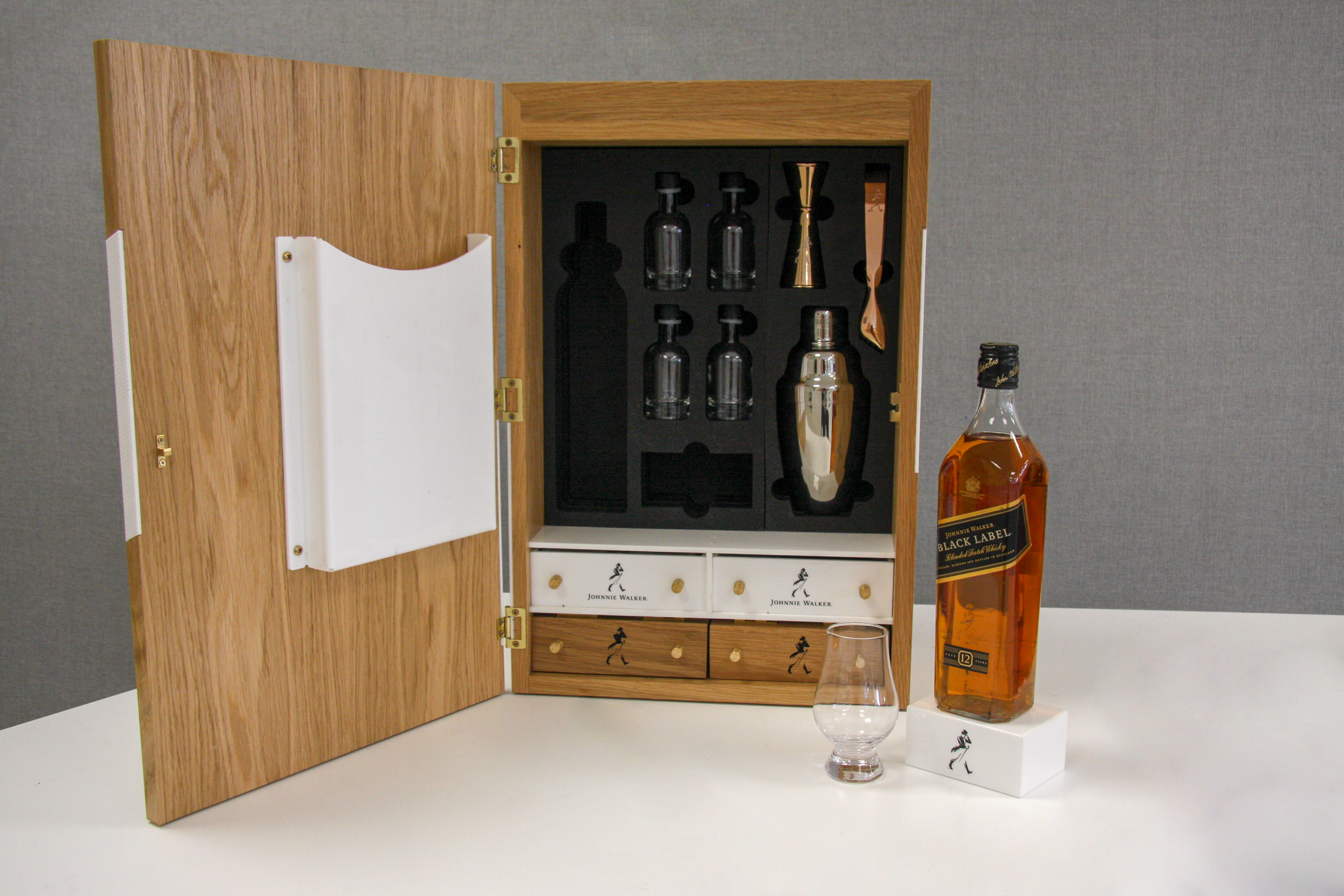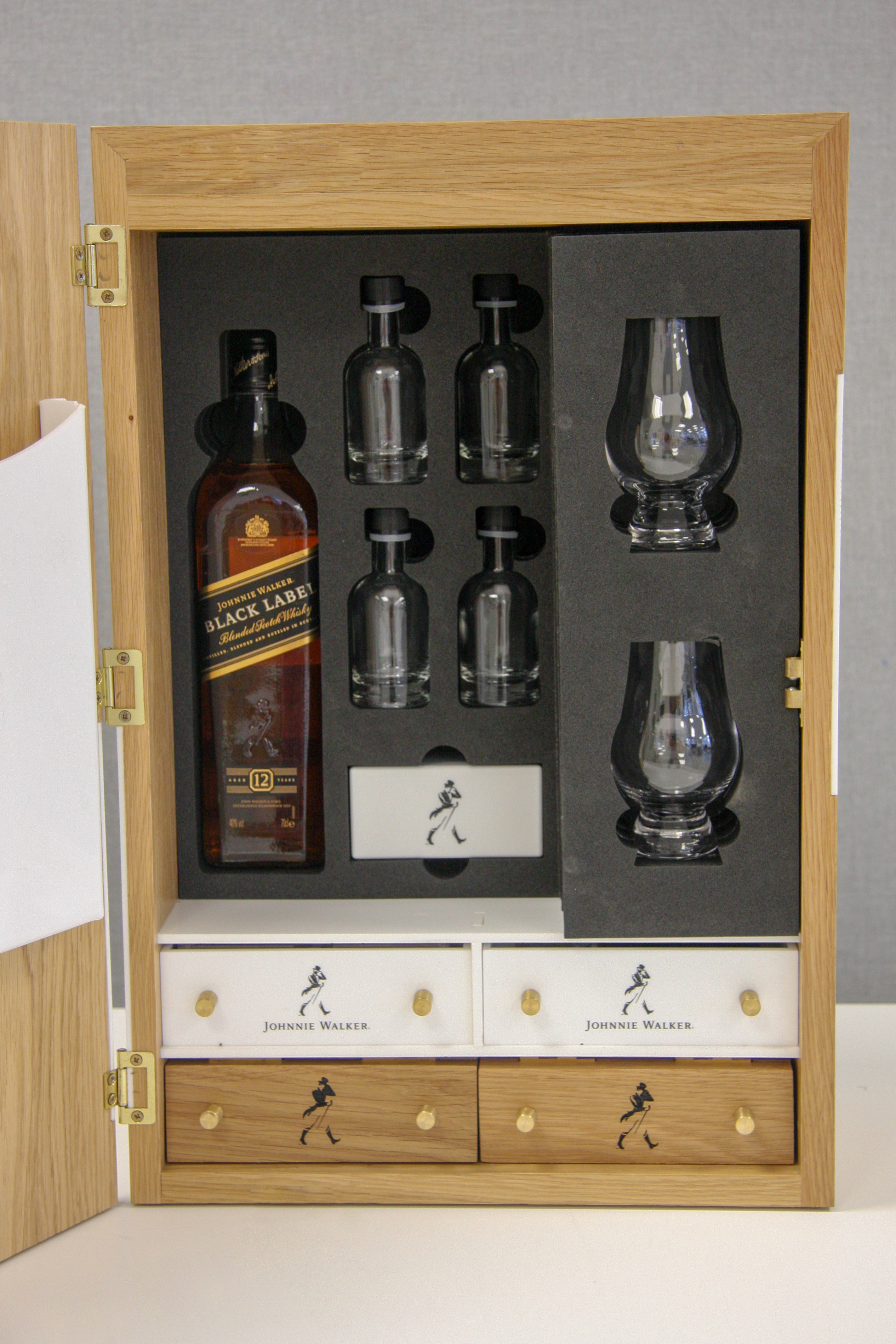 Project description: Interpret the client’s concept and transform it into this mentoring case created to o help understand more about Scotch whisky, tell the story and to get more people enlightened with the brand giving the opportunity to interact with the brand. This is possible with this mentoring case made from a veneer box with white acrylic partition and brass details. Motif apply using vinyls and etching and infilling in black the wooden parts. The ingredients were encapsulated in resin to be able to flight with this case around the world.