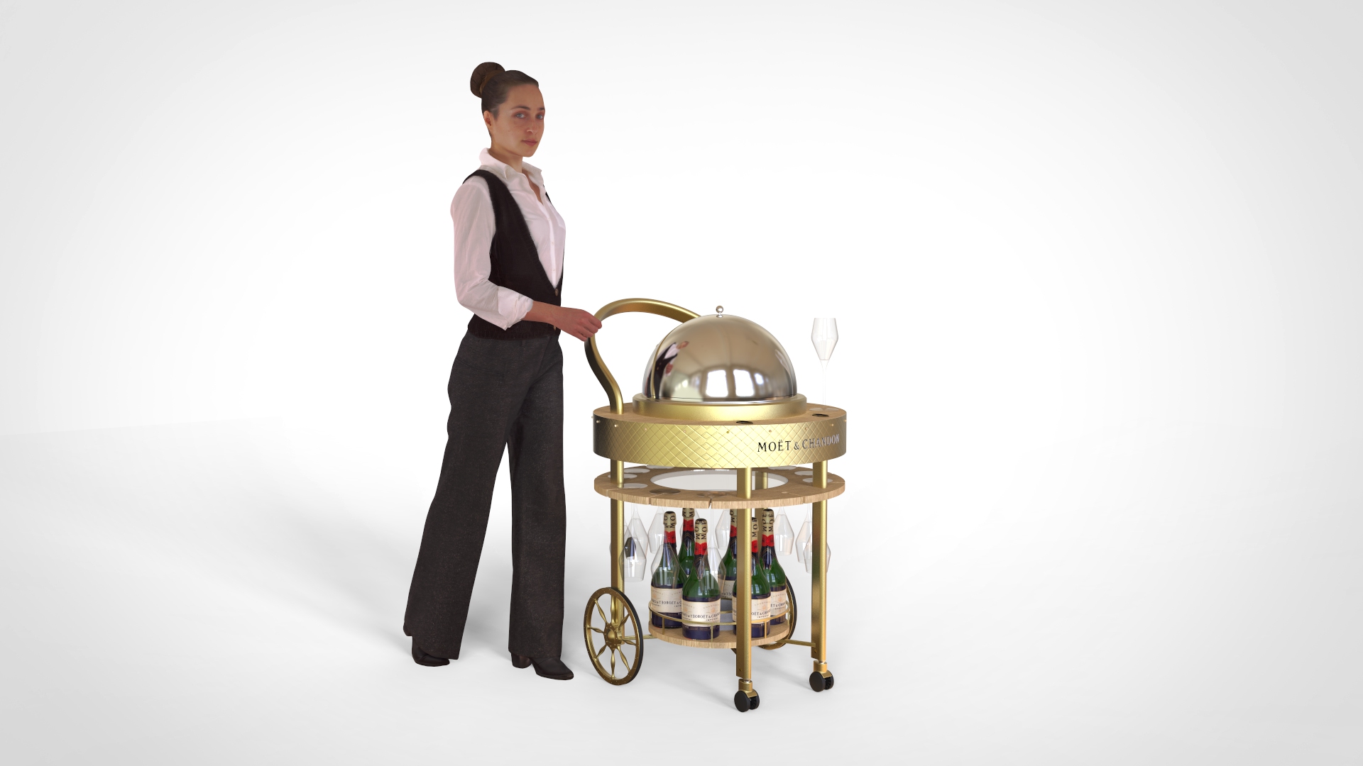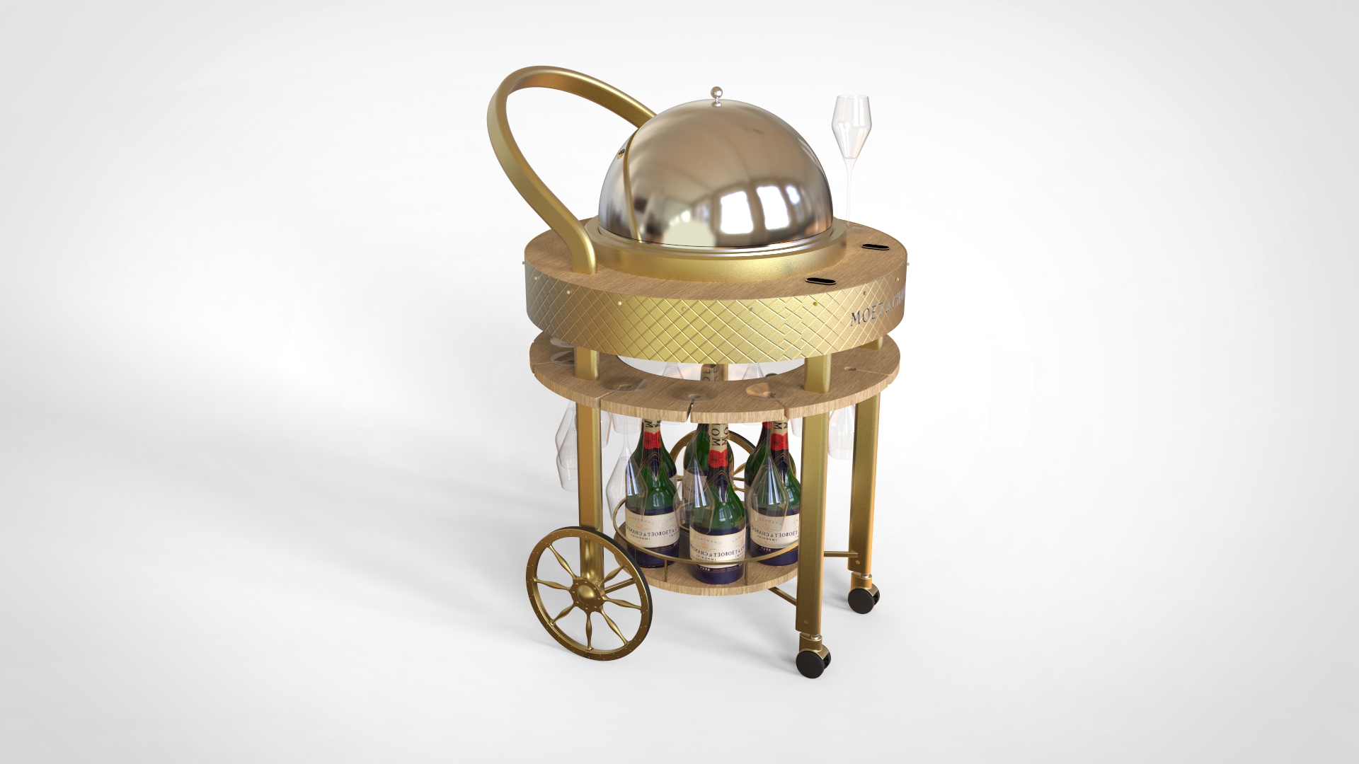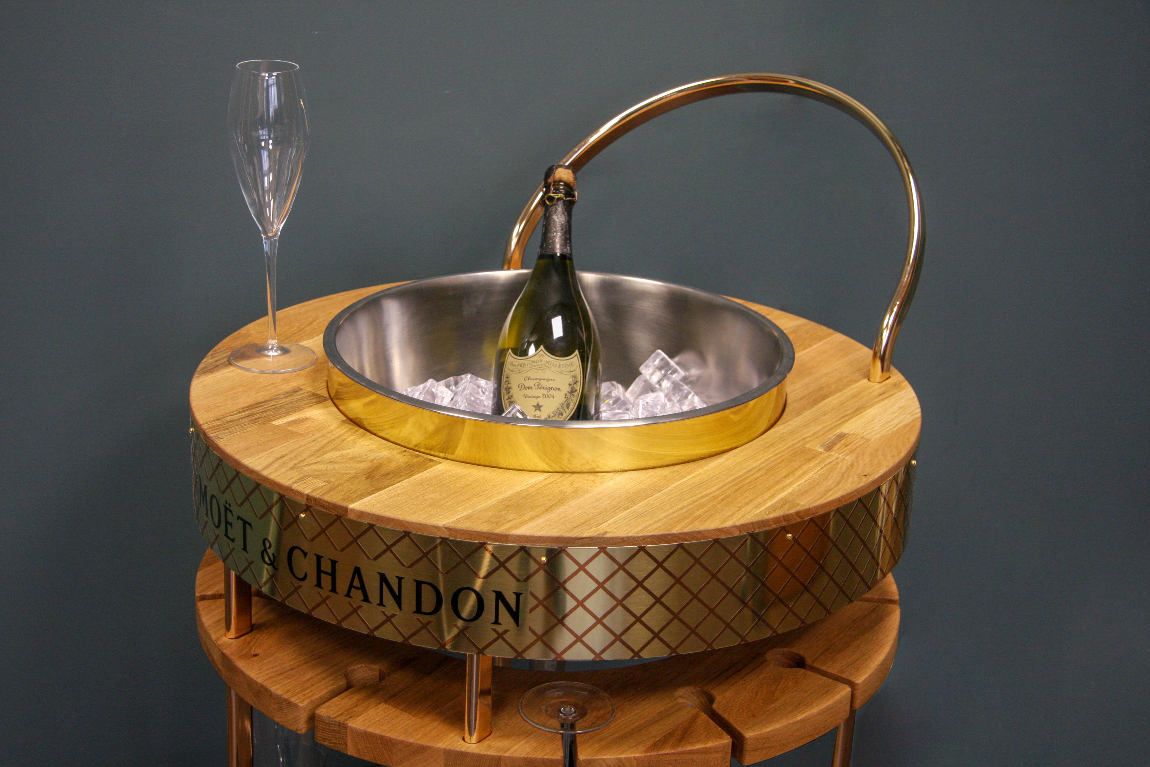 Project description: Design this drinks’ trolley following the clients’ brief focusing on the ability to move easily around the dining tables. The trolley is made from a brass polish structure and solid oak that incorporate a big ice bucket for Magnum bottles and a integrated flute glasses shelf.