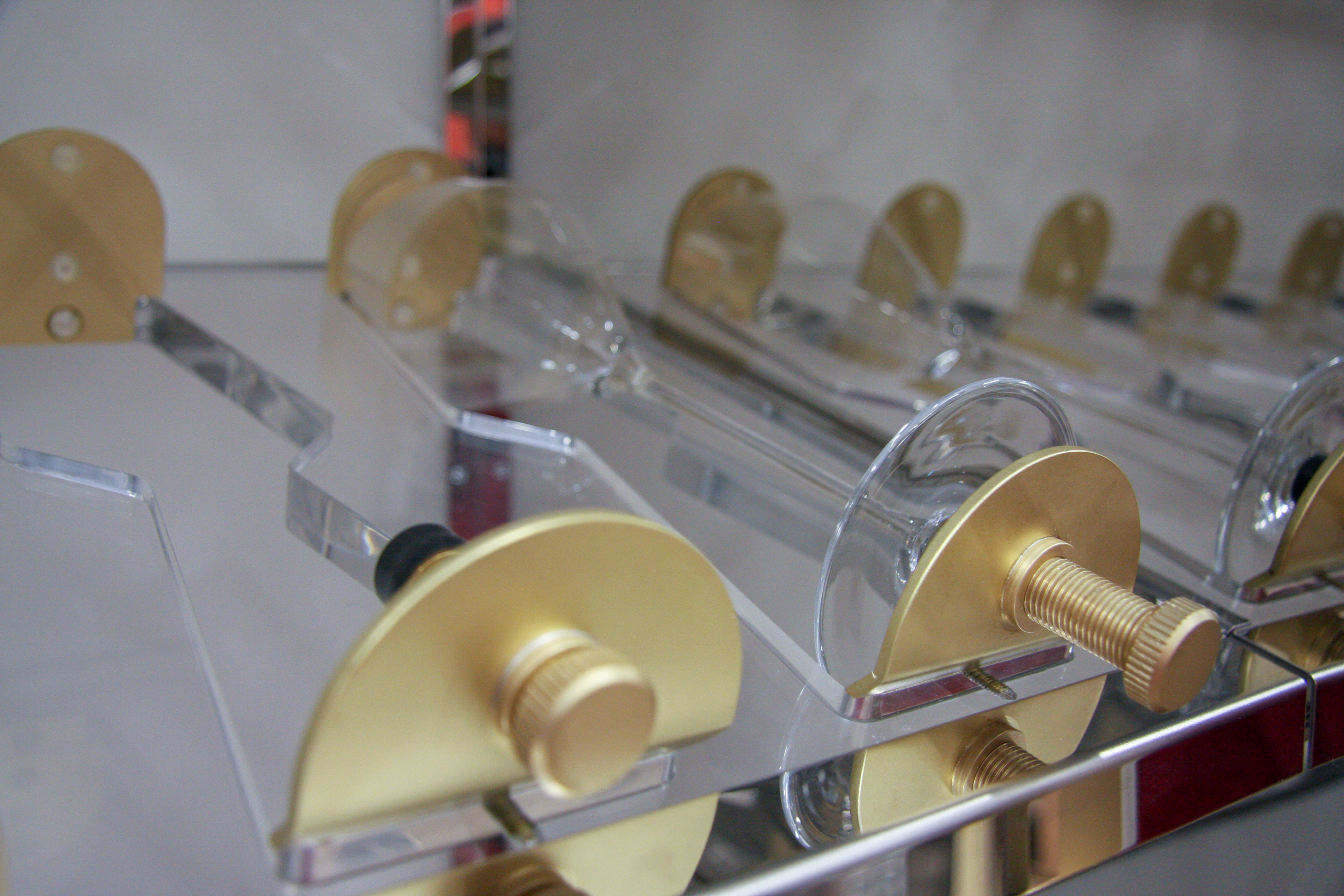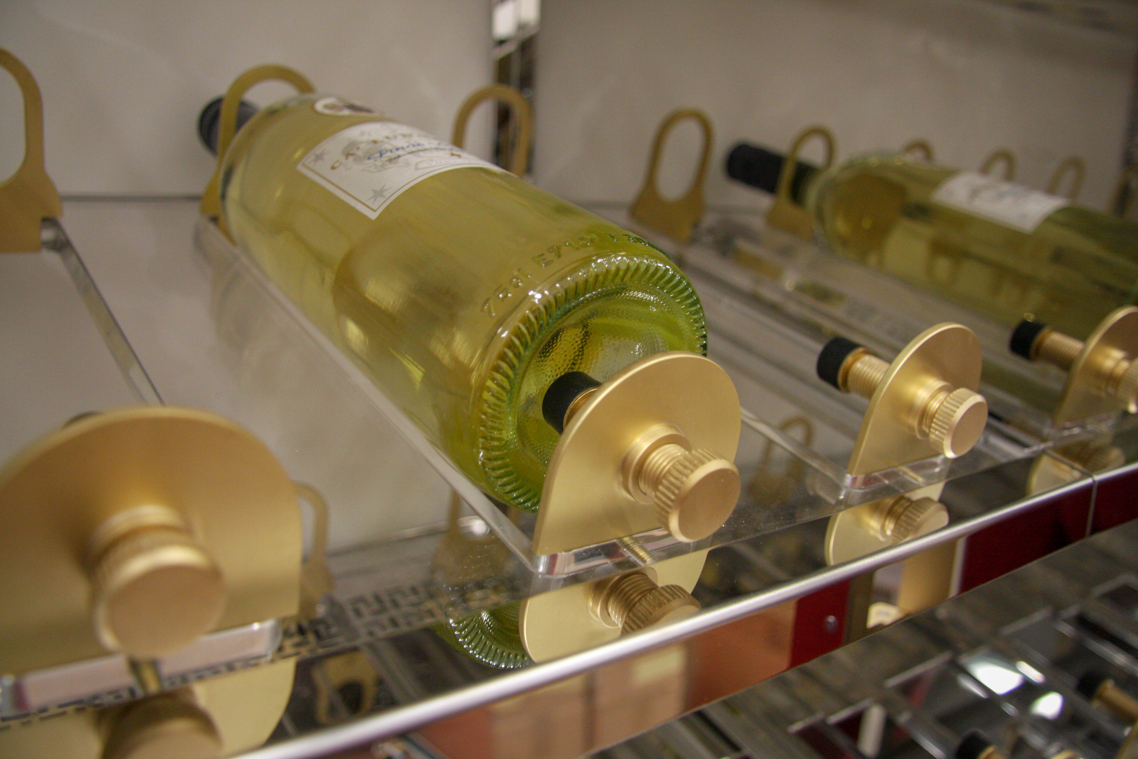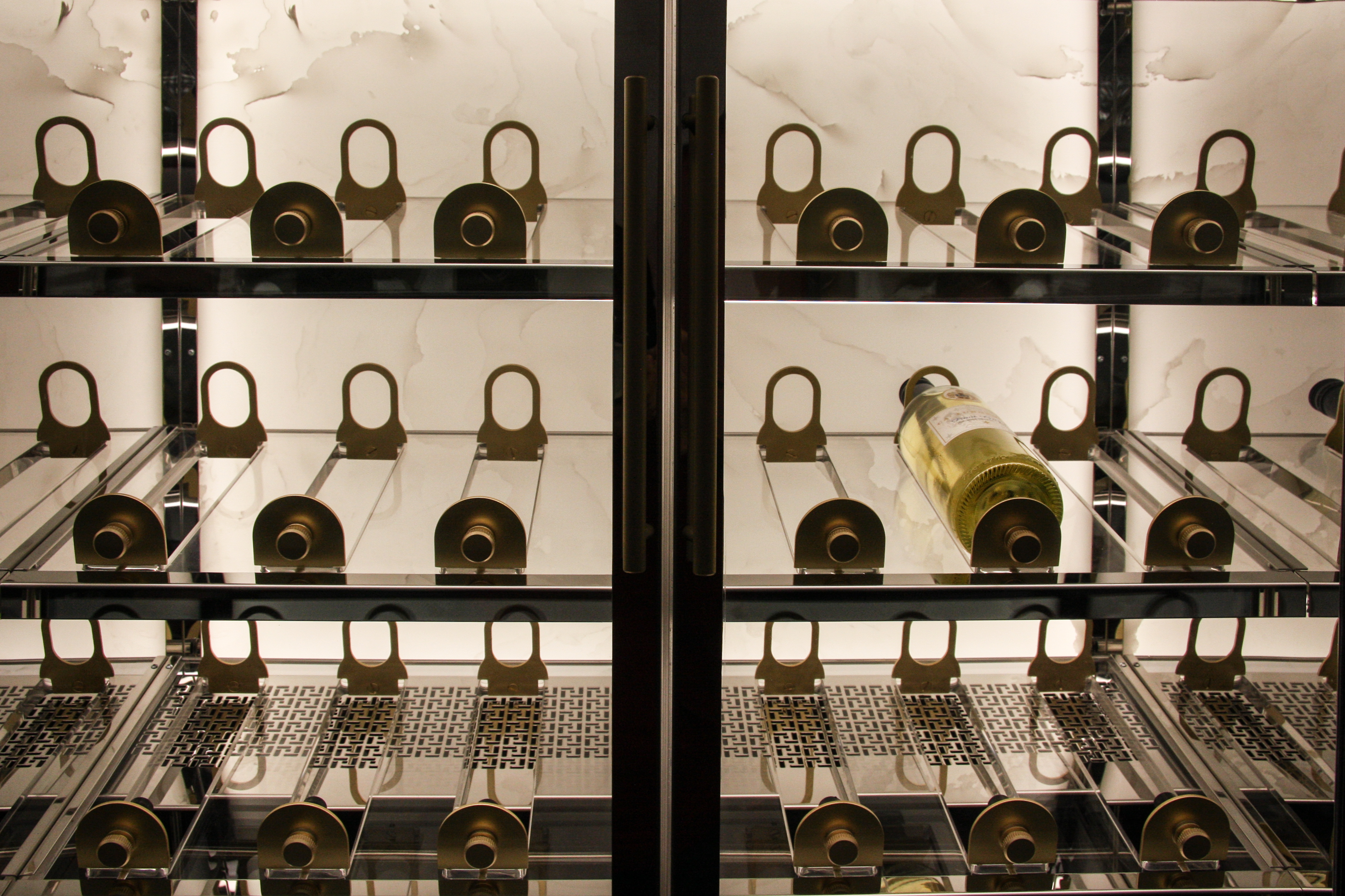 Project description: Luxury custom wine cabinet for a sailing boat. This project consisted of designing and fitting two cabinets, one refrigerated for the wine and the other one to allocate the glasses and wine ware. The challenge was to fit all the elements required for the full function of the wine cabinet in the narrow space without compromising the design. The result was the one above, two customised cabinets made from Rimex, Stainless Steel, brass details, clear acrylic shelves and LED lighting.