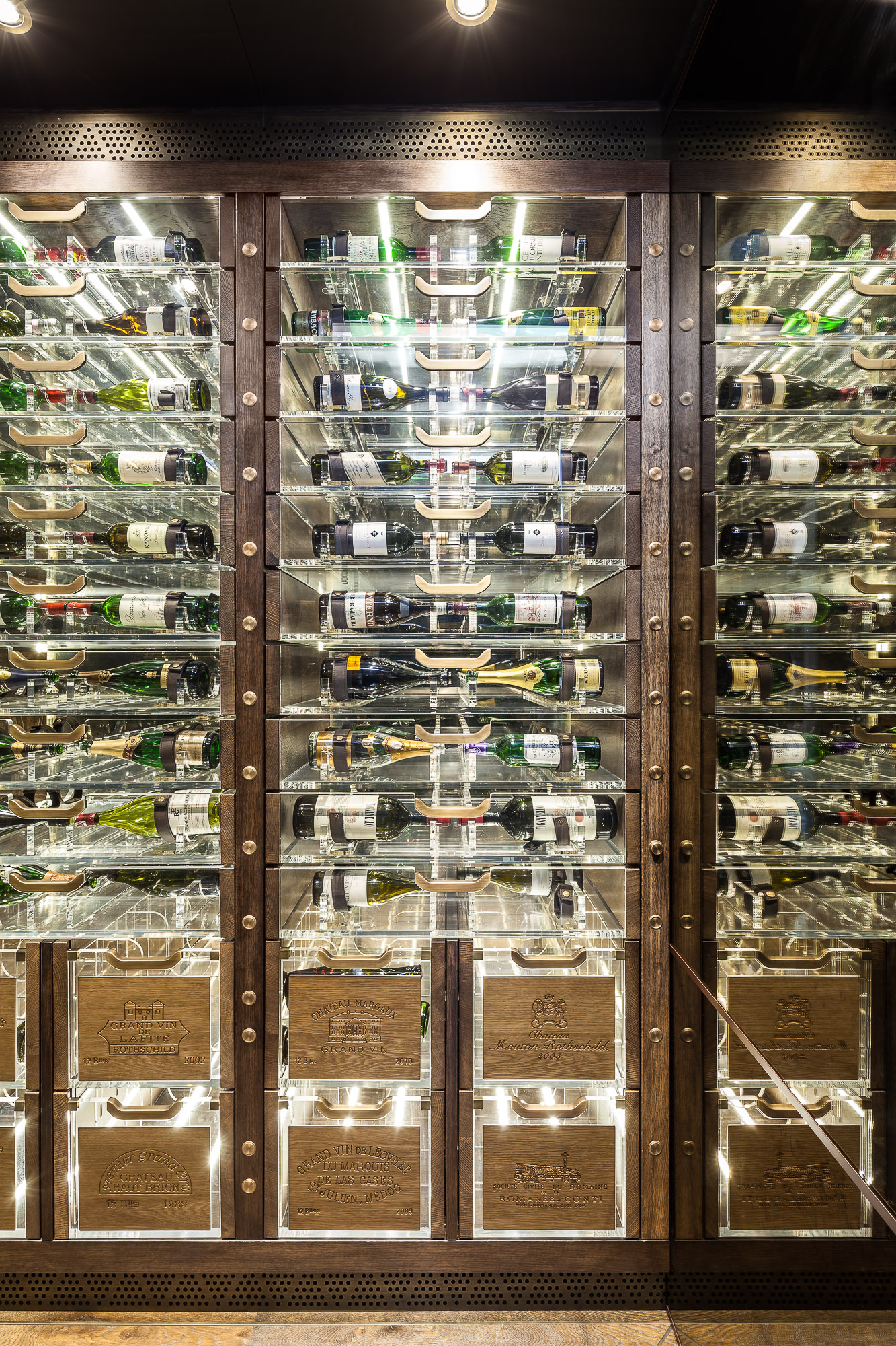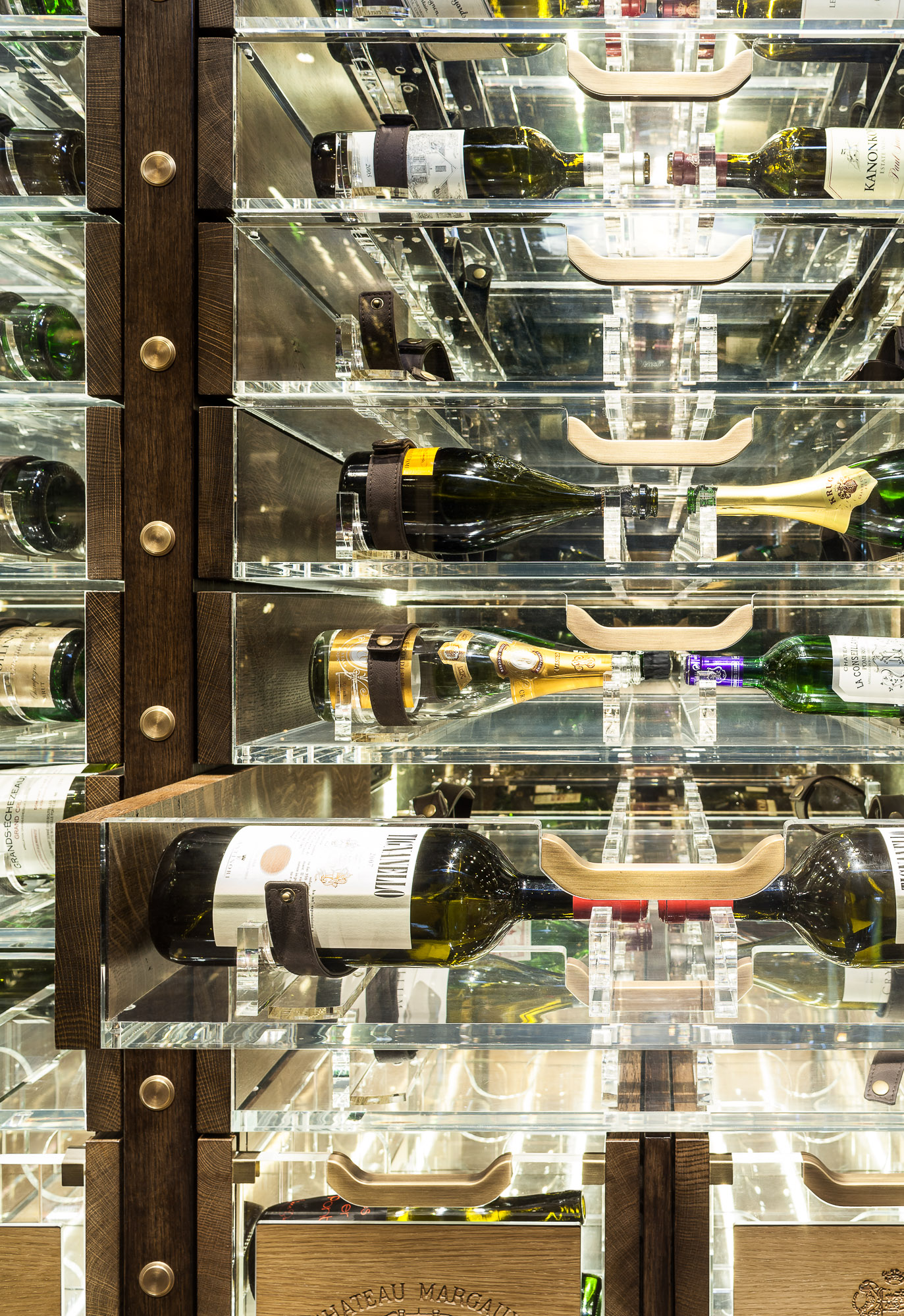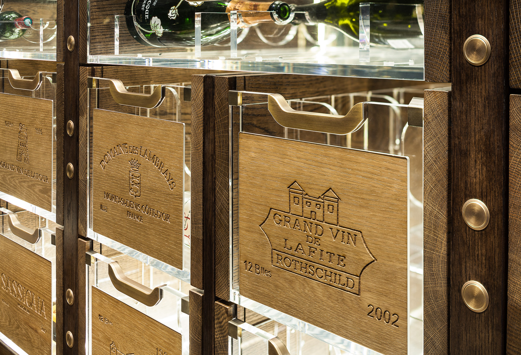 Project description: Creating a wine cellar for a sailing boat was a good challenge for myself and the team, accommodating a 45 degree tilt when sailing was amongst one of the many hurdles. The result was a spectacular combination of dark oak, acrylic and bronze drawers with leather straps for all bottles to ensure they kept in place. Total capacity 500 bottles.